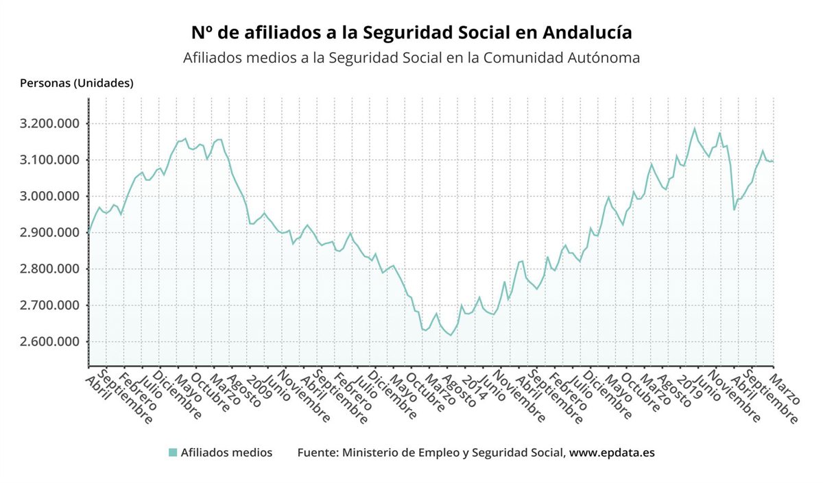 Evolución del número de afiliados a la Seguridad Social en Andalucía. - EPDATA