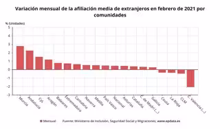 Variación mensual de la afiliación media de extranjeros en febrero de 2021 por comunidades. - EPDATA