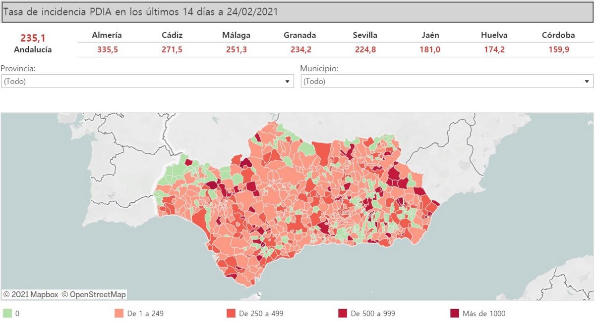 Mapa de incidencia del Covid-19 en Andalucía por municipios a 24 de febrero de 2021 - JUNTA DE ANDALUCÍA