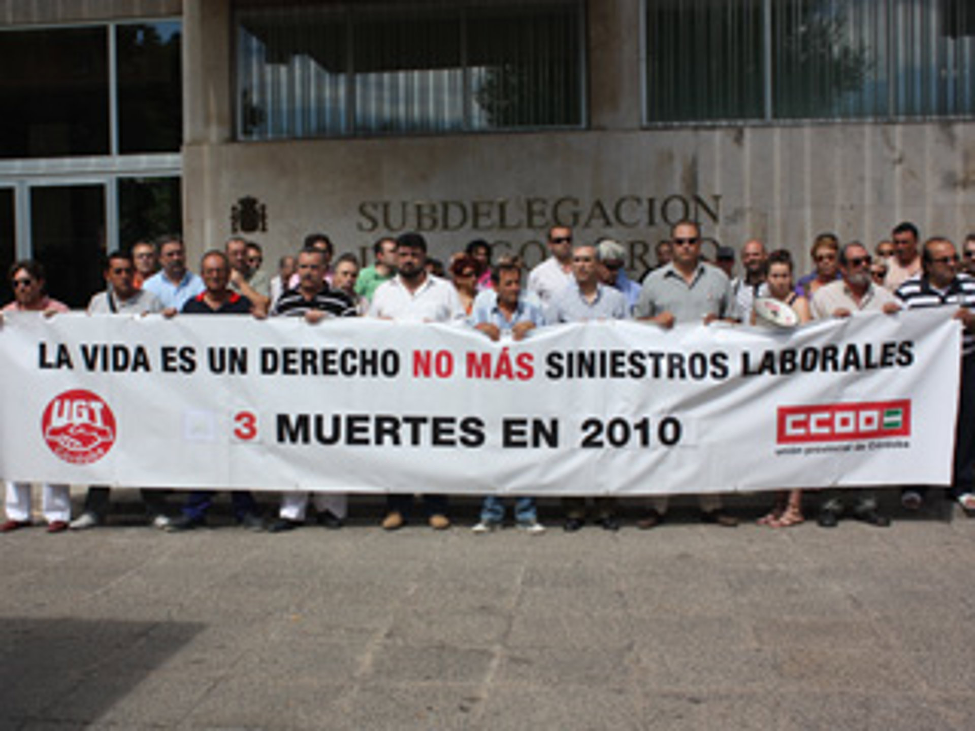 Sindicalistas de UGT y de CCOO se han concentrado este miércoles ante la Subdelegación del Gobierno central en Córdoba, como ya es habitual tras cada siniestro laboral mortal que se produce en la provincia, en este caso en protesta por la muerte de un trabajador de 26 años que falleció tras precipitarse al vacío al ceder una de las placas del techo de una nave industrial en Lucena (Córdoba) donde instalaba paneles fotovoltaicos.