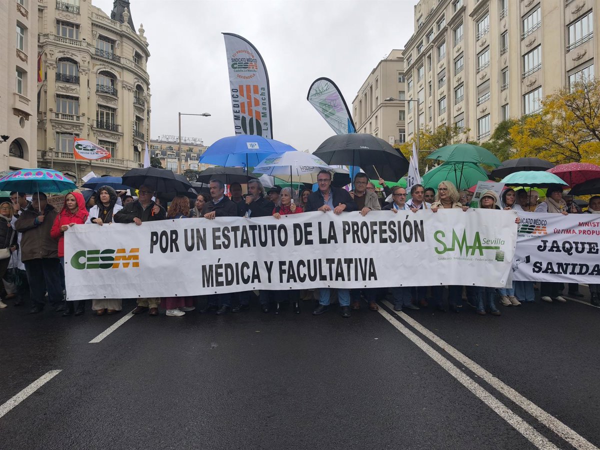 Tal y como ha emitido el propio sindicato en una nota, a pesar de la lluvia y de las inclemencias meteorológicas, "miles de facultativos" de toda España, entre ellos una "importante representación" de médicos andaluces, han vuelto a mostrar su "rechazo frontal" a la propuesta de Estatuto Marco del Ministerio de Sanidad, que consideran "fracasada" y que "agrava la precariedad laboral y amenaza la supervivencia de la sanidad pública".