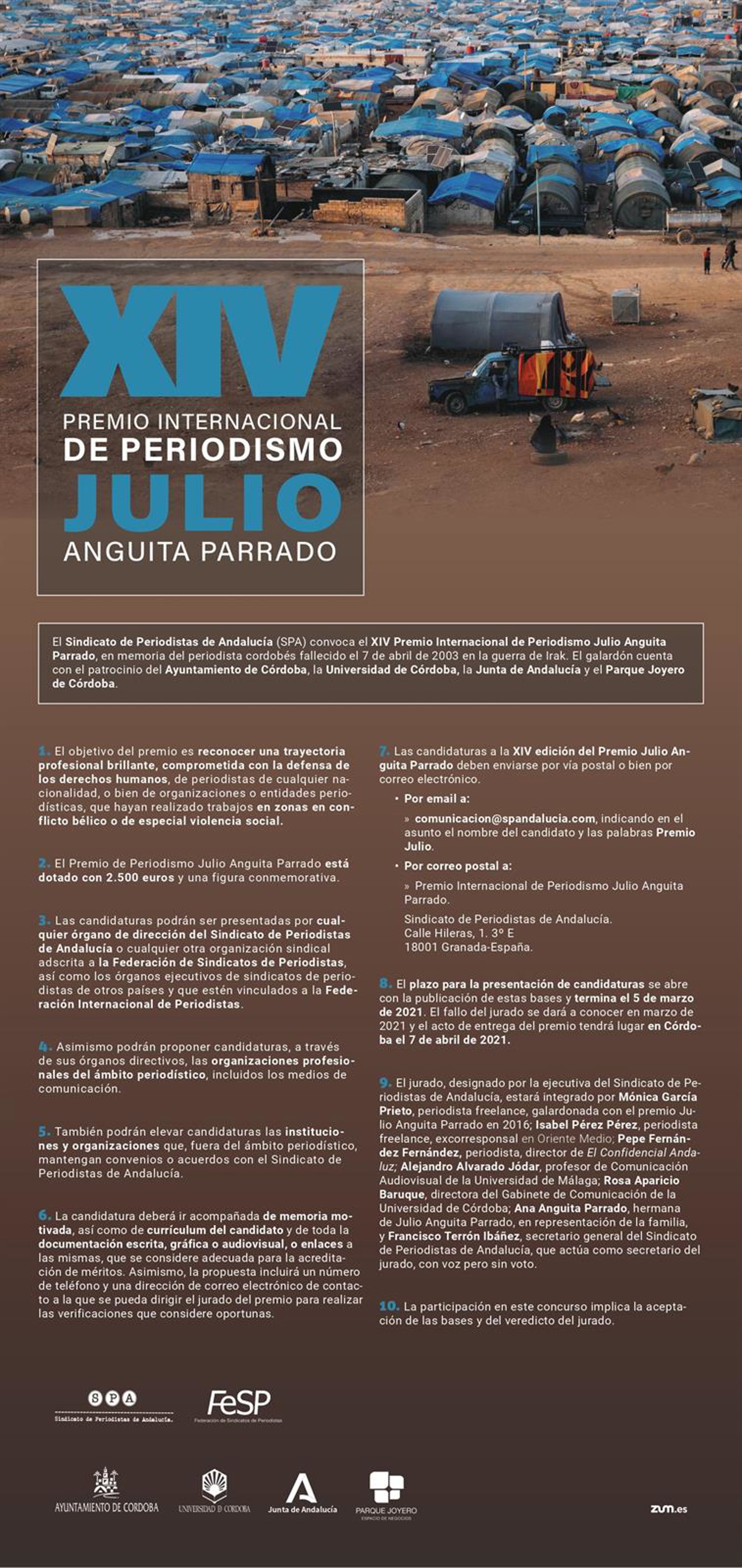 El Sindicato de Periodistas de Andalucía (SPA) ha convocado el XIV Premio Internacional de Periodismo Julio Anguita Parrado, creado en memoria del periodista cordobés fallecido el 7 de abril de 2003 en la Guerra de Irak, y que cuenta con el patrocinio del Ayuntamiento y la Universidad de Córdoba (UCO), la Junta de Andalucía y el Parque Joyero de Córdoba.