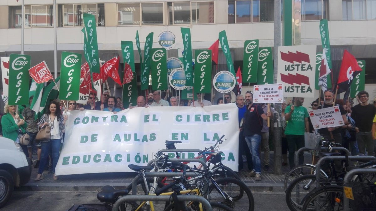 Representantes de diversas organizaciones sindicales y de estudiantes, y también de Ampas y otros colectivos de Córdoba, se han concentrado este miércoles ante la Delegación de Educación de la Junta de Andalucía en dicha provincia "contra el cierre de aulas en la educación pública".