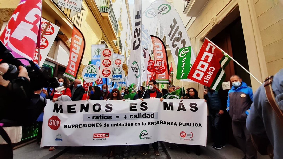 CSIF, ANPE, CCOO y UGT en Andalucía han protagonizado este miércoles concentraciones en las delegaciones territoriales de Educación y Deporte de la Junta de Andalucía en las ocho provincias, para expresar "su rechazo a la supresión de unidades" en la escuela pública andaluza y para reivindicar una bajada de la ratio en las aulas.