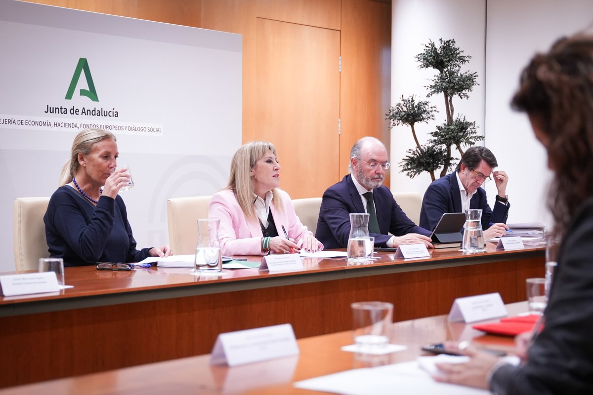 La consejera de Economía, Hacienda, Fondos Europeos y Diálogo Social y portavoz de la Junta de Andalucía, Carolina España (c), durante la reunión de seguimiento del Pacto Social. A 25 de febrero de 2026, en Sevilla (Andalucía, España). - María José López - Europa Press