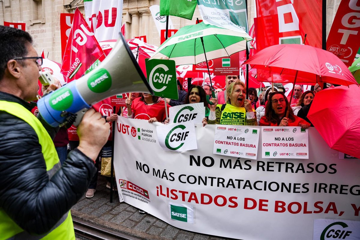 Concentración convocada por los sindicatos CCOO, UGT, CSIF y Satse para exigir la actualización de la bolsa de empleo del Servicio Andaluz de Salud (SAS). A 03 de abril de 2025, en Sevilla (Andalucía, España). - María José López - Europa Press