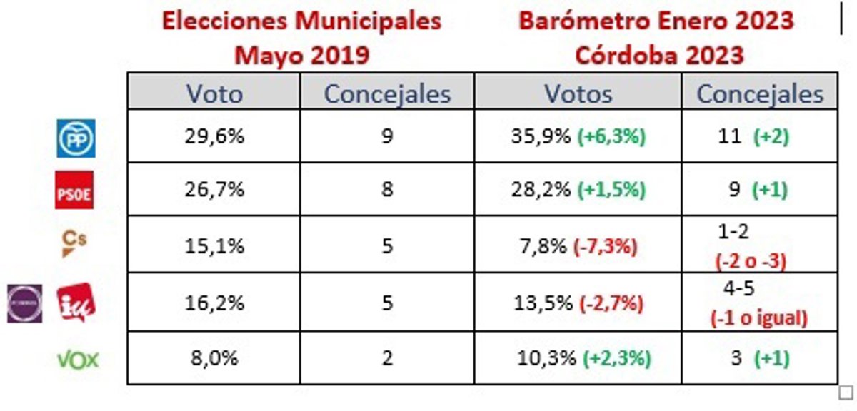El PSOE, que ahora tiene ocho concejales, "contaría con el 28,20 por ciento de la confianza social de la población cordobesa; 1,5 puntos más que en las pasadas elecciones municipales", lo que le reportaría nueve concejales, mientras que IU y Podemos, "que se presentan conjuntamente con la marca Hacemos Córdoba" y que ahora suman por separado cinco concejales, "contarían con un 14 por ciento de los votos; 2,7 puntos menos que en las pasadas elecciones municipales", con lo que lograrían cuatro o cinco ediles.