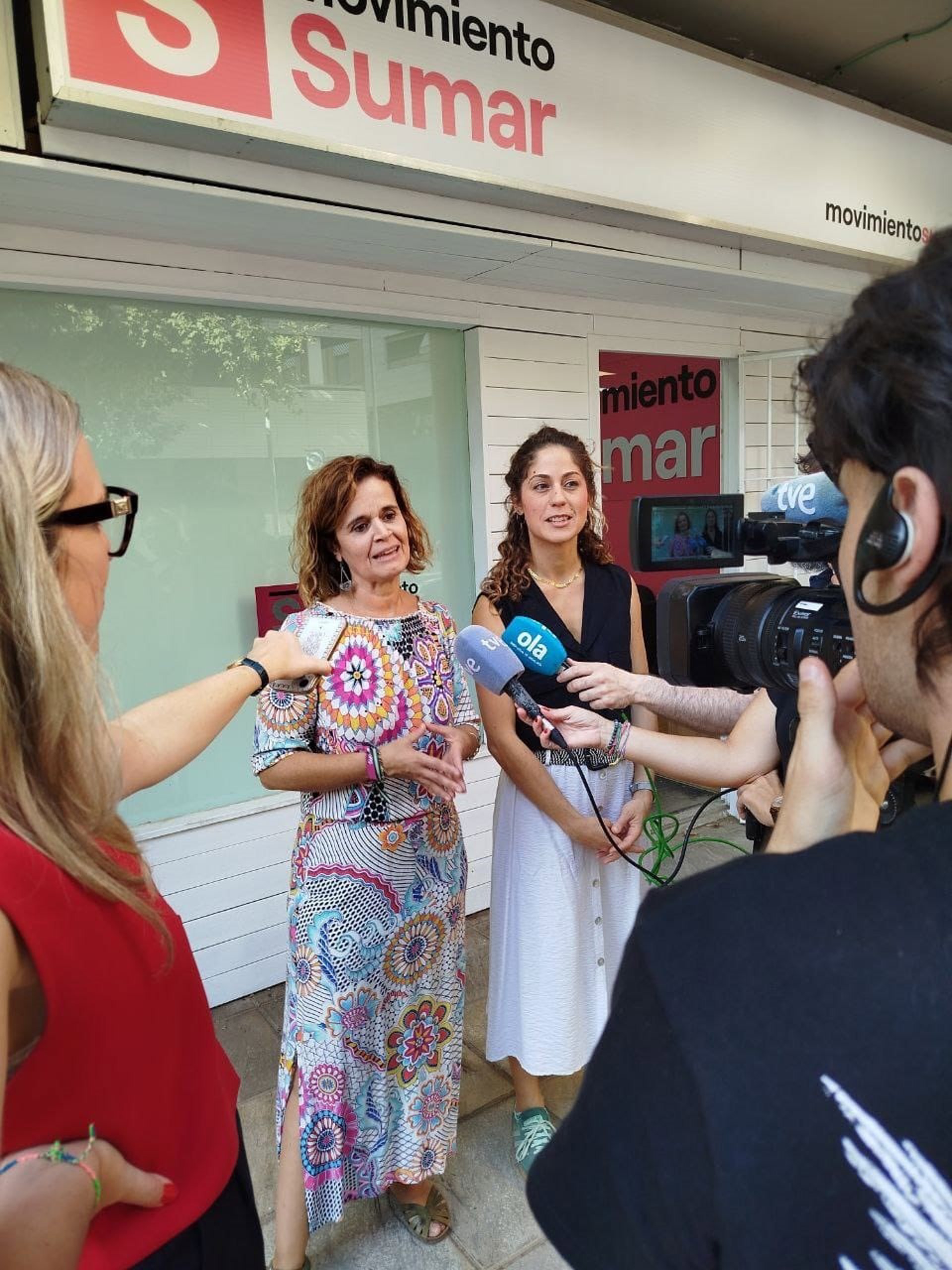 La coordinadora de Movimiento Sumar Andalucía, Esperanza Gómez, atiende a los medios junto a Lara Hernández en Sevilla. - MOVIMIENTO SUMAR ANDALUCÍA