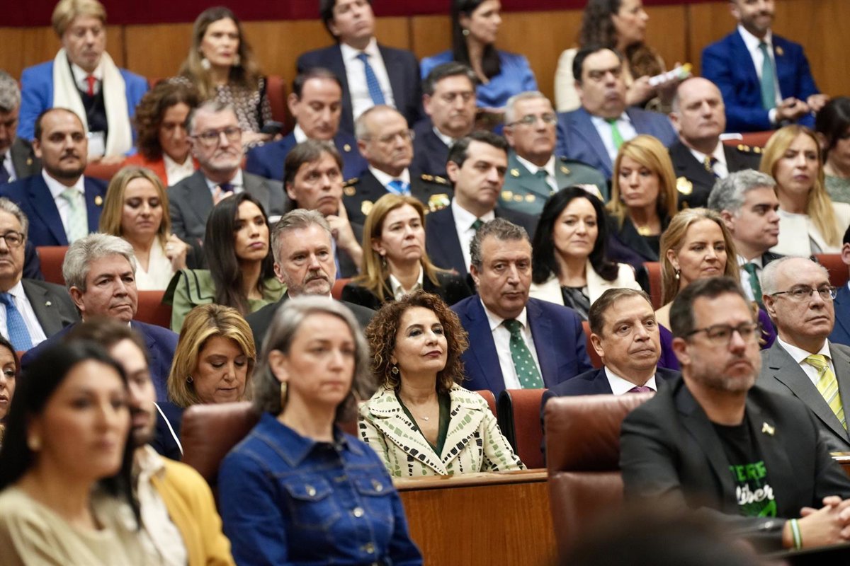 La vicepresidenta primera y ministra de Hacienda y candidata a la Junta de Andalucía del PSOE-A, María Jesús Montero, y la exsecretaria general del PSOE-A Susana Díaz, en el Pleno del Parlamento el día de Andalucía, el pasado 28 de febrero. (Foto archivo) - MARÍA JOSÉ LÓPEZ / EUROPA PRESS