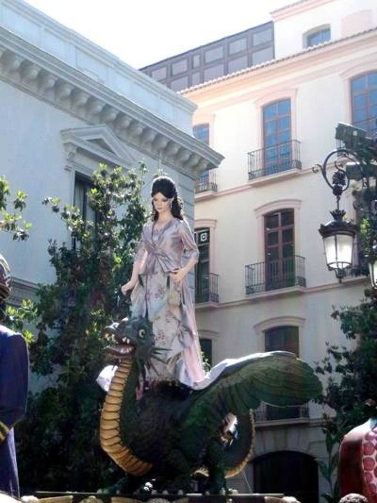 La Tarasca desfilará este miércoles por las calles de Granada subida en un dragón para anunciar los días grandes del Corpus Christi y, según marca la tradición, mostrar las tendencias de moda de la temporada a través de su vestido, que este año ha sido diseñado por Pilar Torrecillas.