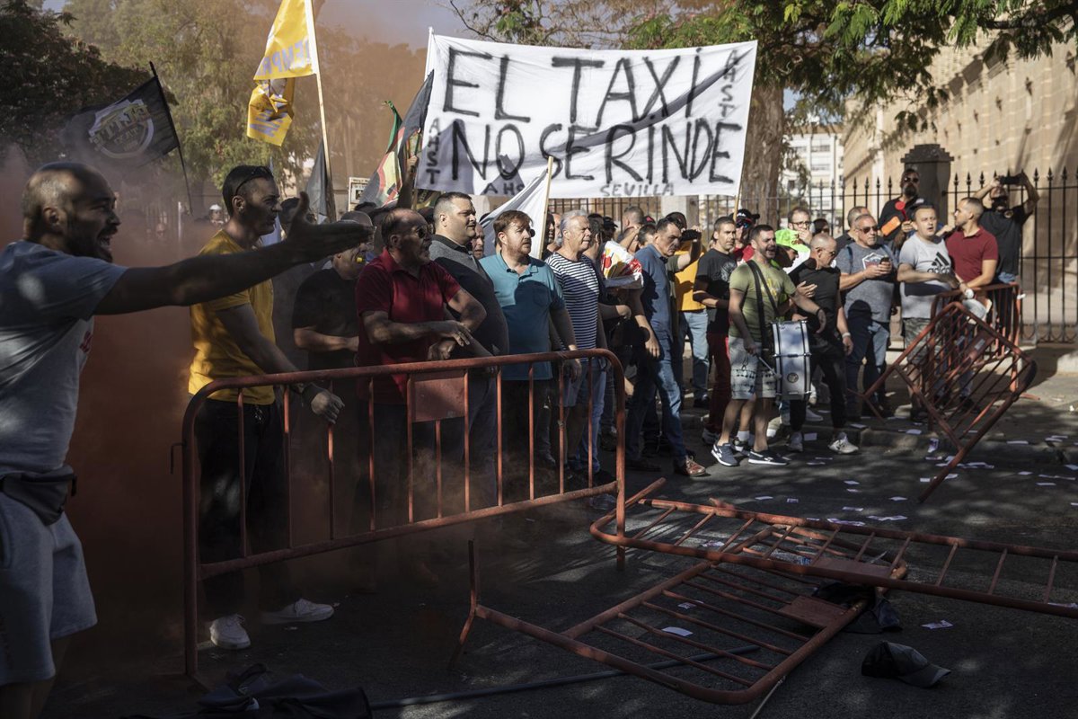 El taxi andaluz vuelve a manifestarse este jueves en Sevilla contra la regulación que prepara la Junta para que los Vehículos de Transporte con Conductor (VTC) sigan operando en los núcleos urbanos a partir del 1 de octubre, una cuestión que hace una semana concentró a un millar de taxistas ante el Parlamento andaluz con un saldo final de dos detenidos y varias cargas policiales.