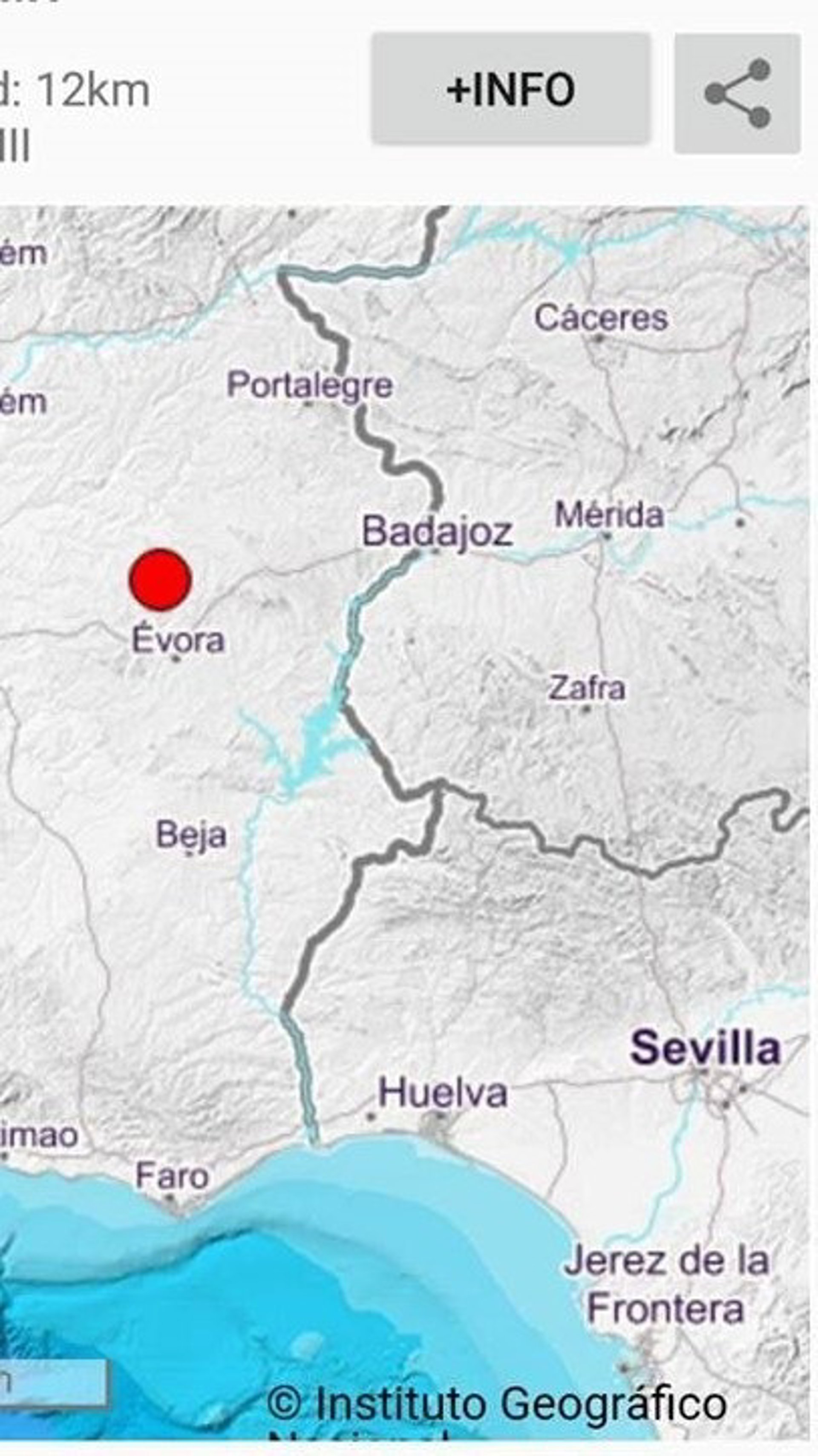 El 112 ha realizado asimismo una ronda de seguimiento con los operativos de emergencia sin que haya constancia de daños. El terremoto ha tenido lugar a las 12,51 horas de este lunes, y su epicentro ha estado en la localidad portuguesa de Arraiolos, a ocho kilómetros de profundidad. La intensidad ha sido considerada "muy fuerte", según los primeros datos de Fomento.