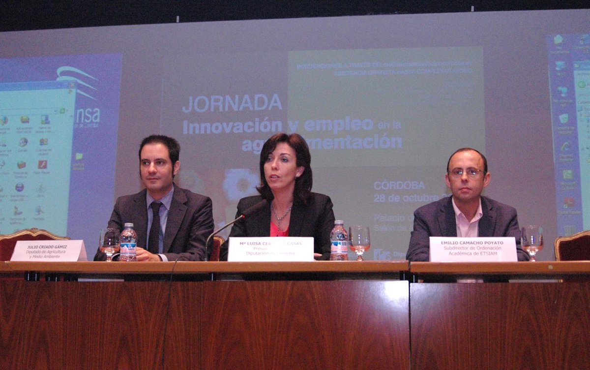 La presidenta de la Diputación de Córdoba, María Luisa Ceballos, el delegado de Agricultura y Medio Ambiente de la institución provincial, Julio Criado, y el subdirector de Ordenación Académica de Escuela Técnica Superior de Ingenieros Agrónomos y de Montes de la Universidad de Córdoba (UCO), Emilio Criado, han hecho entrega este lunes de los Premios Ciencia y Entorno a tres trabajos de investigación el olivar, la dehesa y protección del entorno natural.