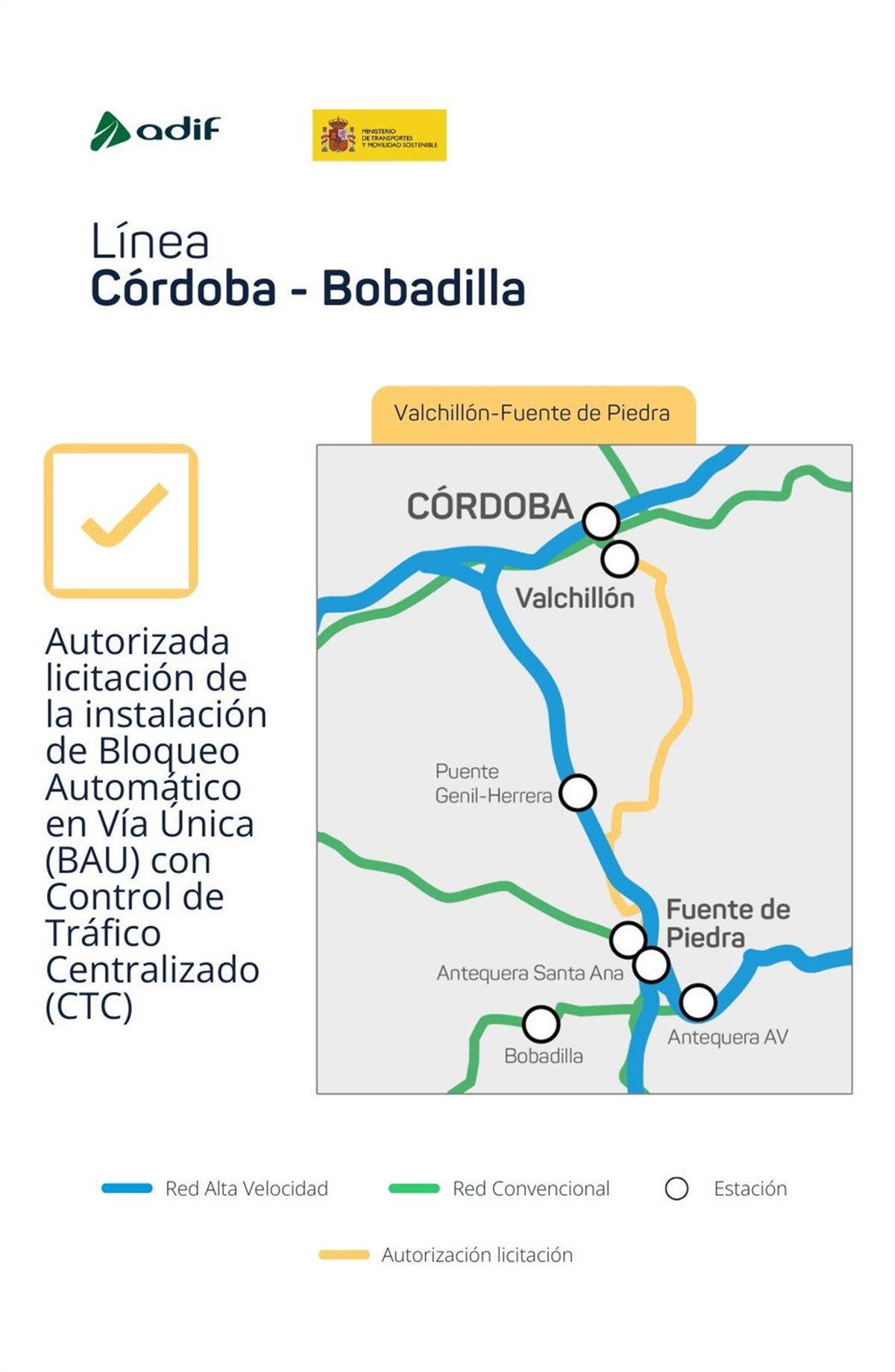 El Ministerio de Transportes y Movilidad Sostenible licitará por 60,4 millones de euros (IVA no incluido), a través de Adif, un contrato para renovar el sistema de señalización en el tramo Valchillón-Torres Cabrera-Fuente de Piedra, en la línea de ancho convencional Córdoba-Bobadilla, entre las provincias de Córdoba y Málaga, incluyendo el contrato la redacción del proyecto y la ejecución de las obras para la instalación del Bloqueo Automático en vía Única (BAU).