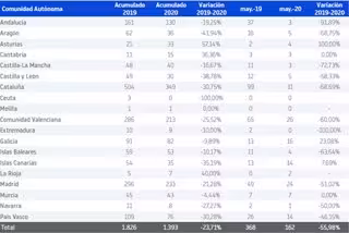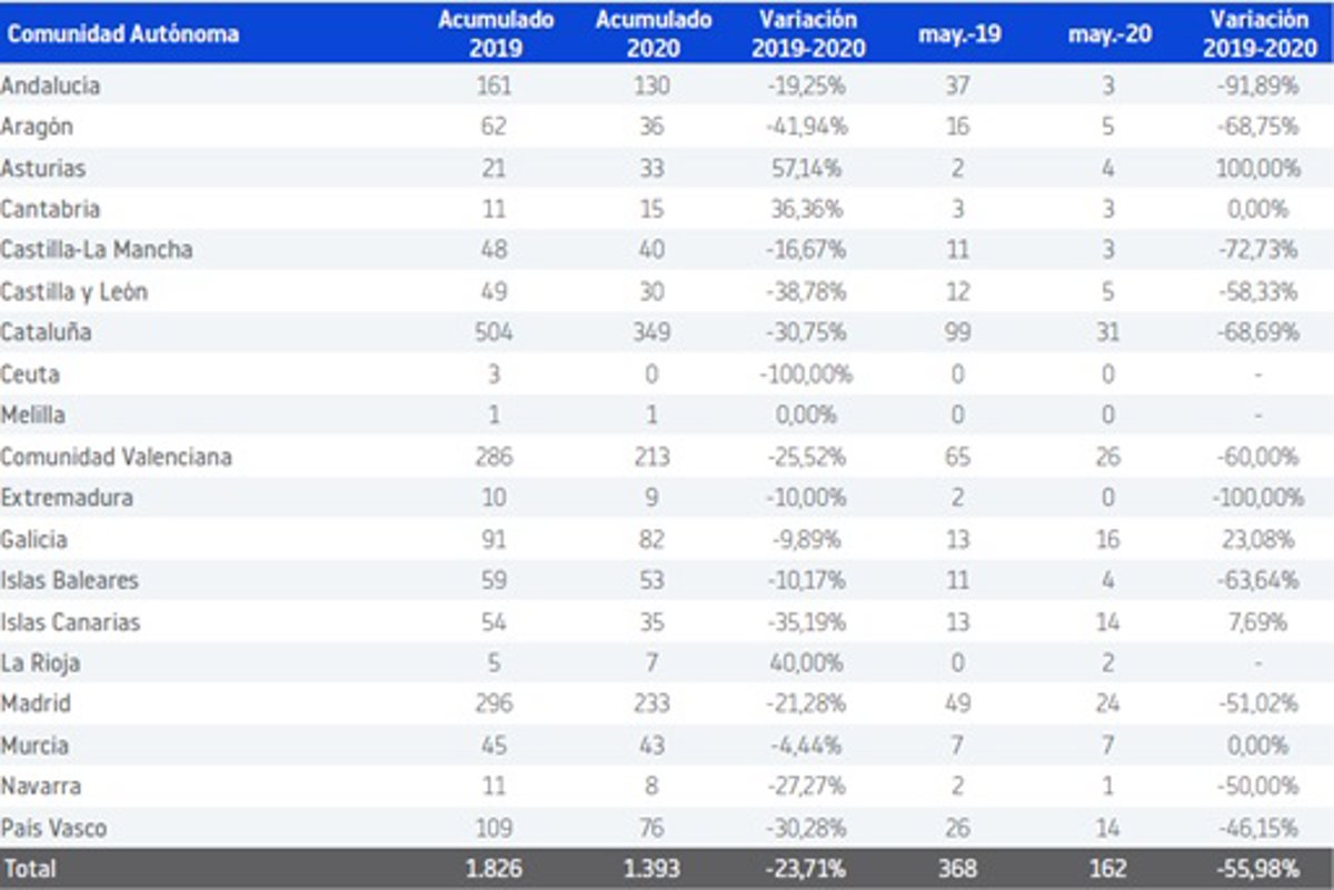 En mayo las comunidades más afectadas son las mismas, aunque con significativos descensos: Madrid recorta un 76 % hasta 127 y Valencia baja un 60 % para quedar en 79. El descenso es generalizado este mes, en casi todas por encima del 50 %.