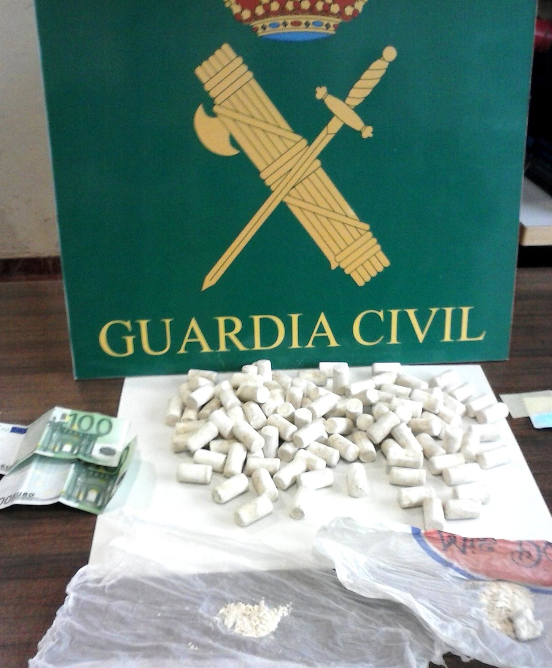 En el bolso también se encontraron 200 euros y dos bolsitas que contenían una sustancia similar a la de los "tapones" hecha polvo que presumiblemente iba destinadas a que la droga pudiera ser probada por posibles compradores.