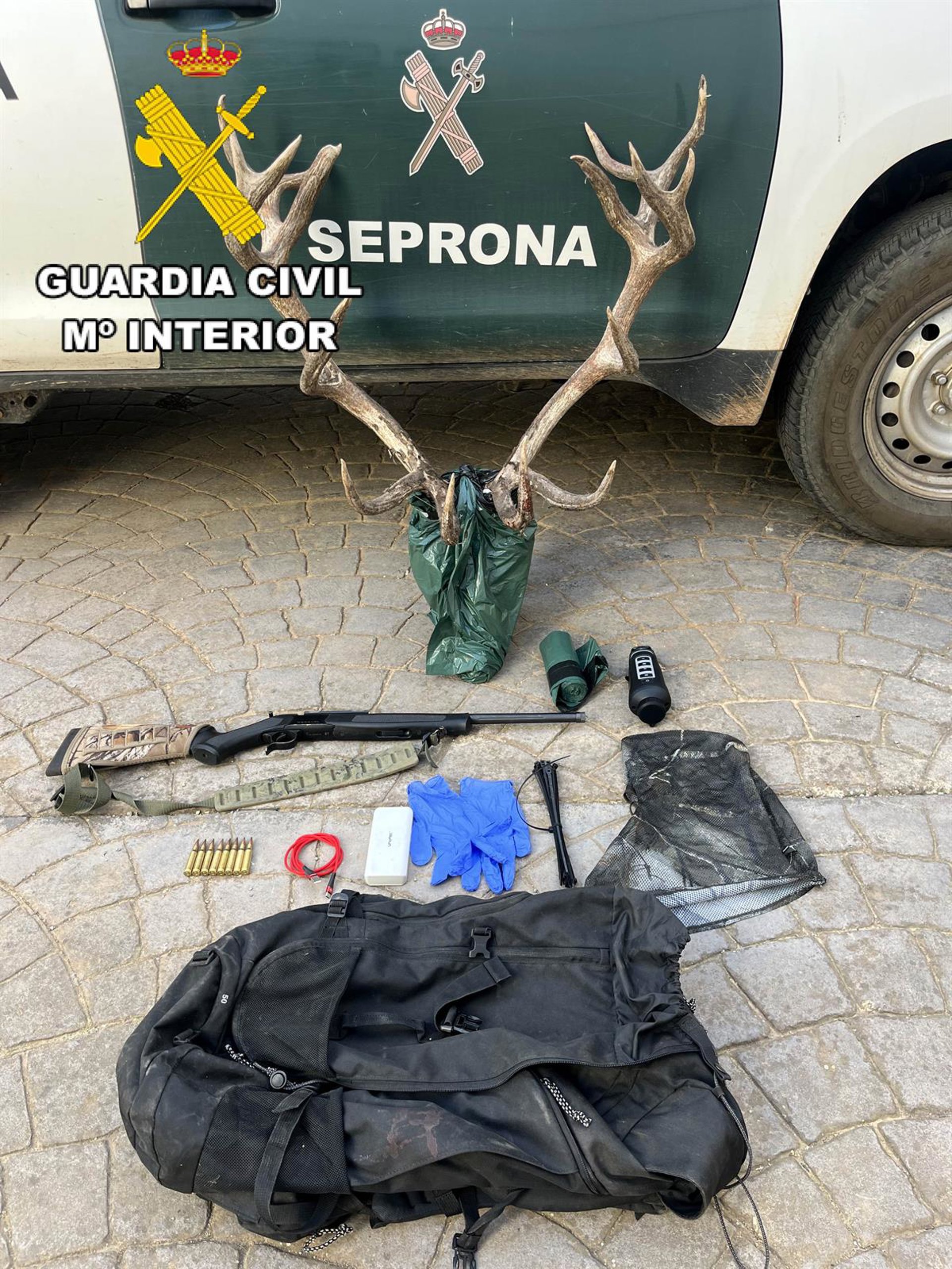 Los agentes observaron la llegada de un vehículo, del que se bajaron dos personas, cada uno con una mochila, que se adentraron en el interior de la finca. Posteriormente, regresaron por el mismo lugar, uno de ellos con un rifle a la espalda y el otro con una cabeza de ciervo de grandes dimensiones colgada en la espalda dentro de una mochila.