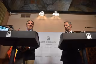 Los consejeros de la Presidencia, Elías Bendodo, y de Hacienda, Juan Bravo, en la rueda de prensa de este jueeves del Consejo de Gobierno. - JUNTA DE ANDALUCÍA