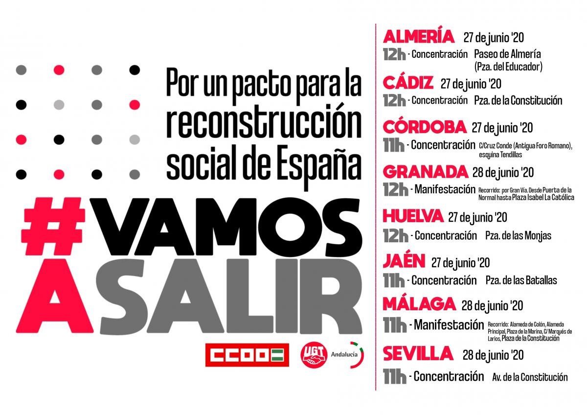 UGT y CCOO de Andalucía se suman este fin de semana a la movilización nacional en demanda de un pacto de reconstrucción social en España "alejado de la confrontación y reforzando los servicios públicos" tras la pandemia ocasionada por el coronavirus.