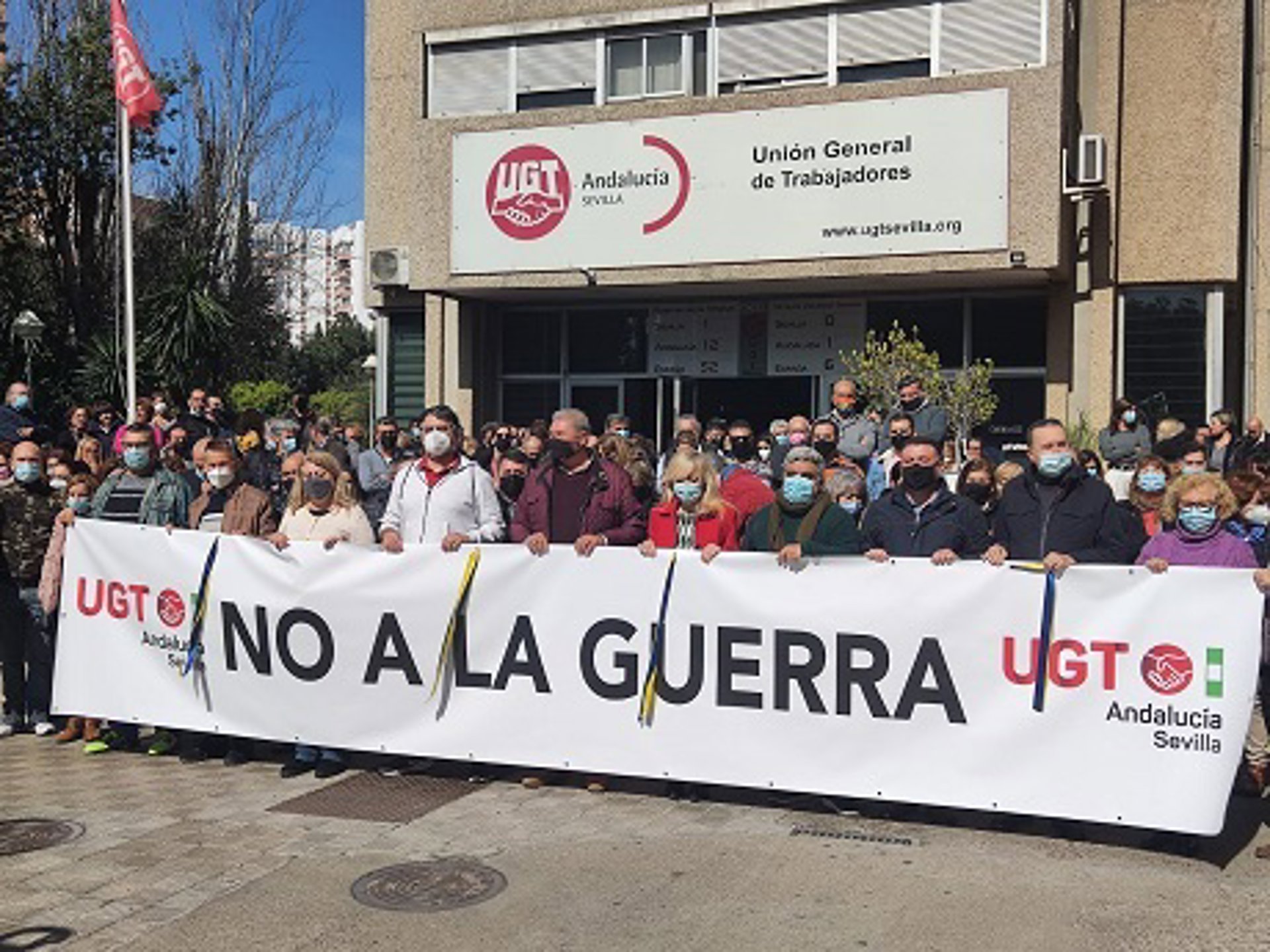 UGT Andalucía se ha concentrado este miércoles en la puerta de la sede del sindicato, como se ha convocado a todas las empresas de todo el país, para exigir el fin de la guerra en Ucrania y la retirada de las tropas rusas en el país.