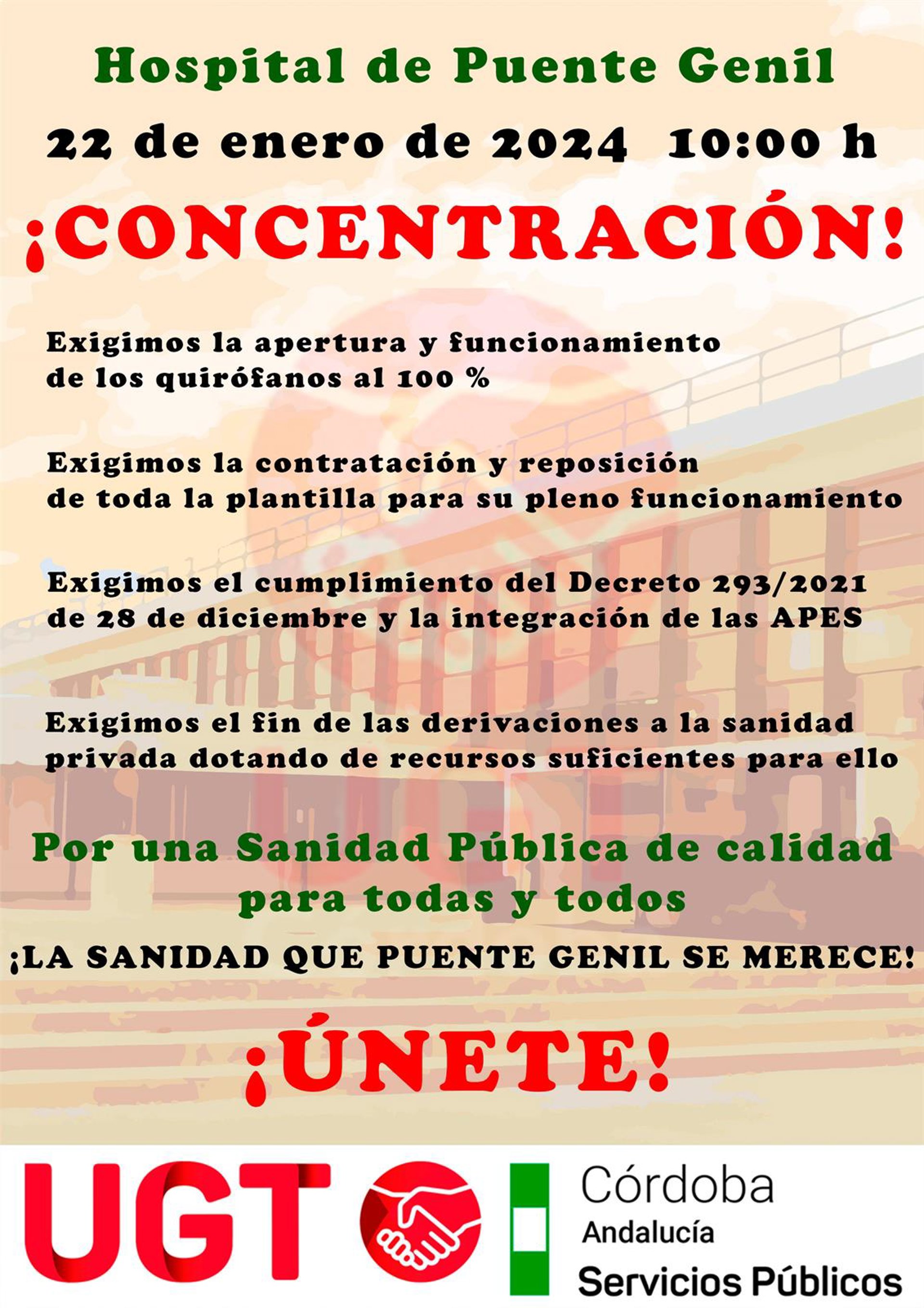 UGT Servicios Públicos de Córdoba ha convocado para el próximo lunes 22 de enero, a las 10,00 horas, una concentración ante las puertas del Hospital de Alta Resolución de Puente Genil (Córdoba), "para exigir la reapertura de los quirófanos, que desde el 1 de enero de este año permanecen cerrados".