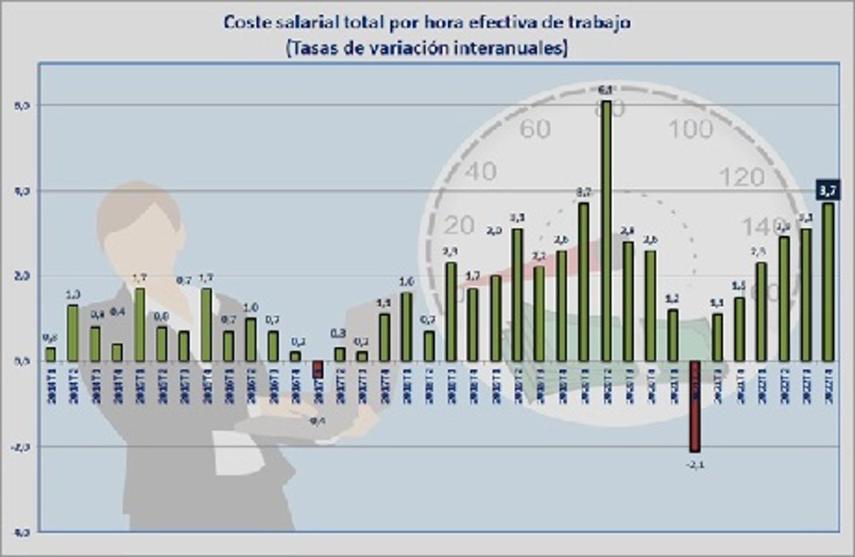 Durante el último trimestre del pasado año, el coste salarial por hora trabajada, a nivel estatal, y una vez eliminados los efectos de la estacionalización y el calendario, apenas si se elevó 3,7 puntos con respecto al mismo trimestre de 2021, porcentaje cuatro décimas superior al aumento interanual experimentado por el conjunto de los costes laborales (3,3%). Por su parte, los otros costes fueron los que registraron un menor incremento, situándose en solo el 2,2%.