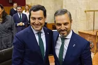 El presidente de la Junta, Juanma Moreno, y el consejero de Hacienda, Juan Bravo, en una imagen de la aprobación en el Pleno del Parlamento del Presupuesto de 2020. - EDUARDO BRIONES/EUROPA PRESS
