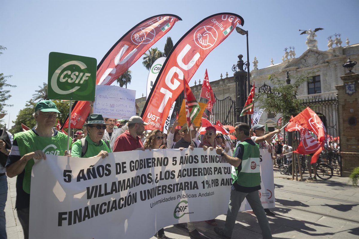 Archivo - Un grupo numeroso de personas con pancartas en la movilización convocada por los sindicatos CCOO, CSIF y UGT en defensa de derechos del personal de universidades públicas, a 15 de junio del 2023 en Sevilla (Andalucía, España). - Rocío Fernández Ruz / Europa Press - Archivo