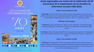 Por otro lado, el miércoles se inaugurará la exposición fotográfica '70 años de la formación de la Enfermería Giennense (1954-2024)' a las 11,00 horas en el edificio A3 del Campus Las Lagunillas. Después, está prevista la mesa redonda 'Evolución de los estudios de Enfermería en Jaén a lo largo de 70 años'.