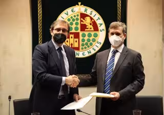 El rector de la Universidad de Jaén (UJA), Juan Gómez, y el director general de la planta de Valeo Iluminación en Martos (Jaén), Manuel Sánchez, han firmado el convenio de colaboración para el desarrollo de este programa cuyo objetivo principal es realizar una formación integral de los participantes, que mejore sus competencias y empleabilidad en el sector de la iluminación en automoción.