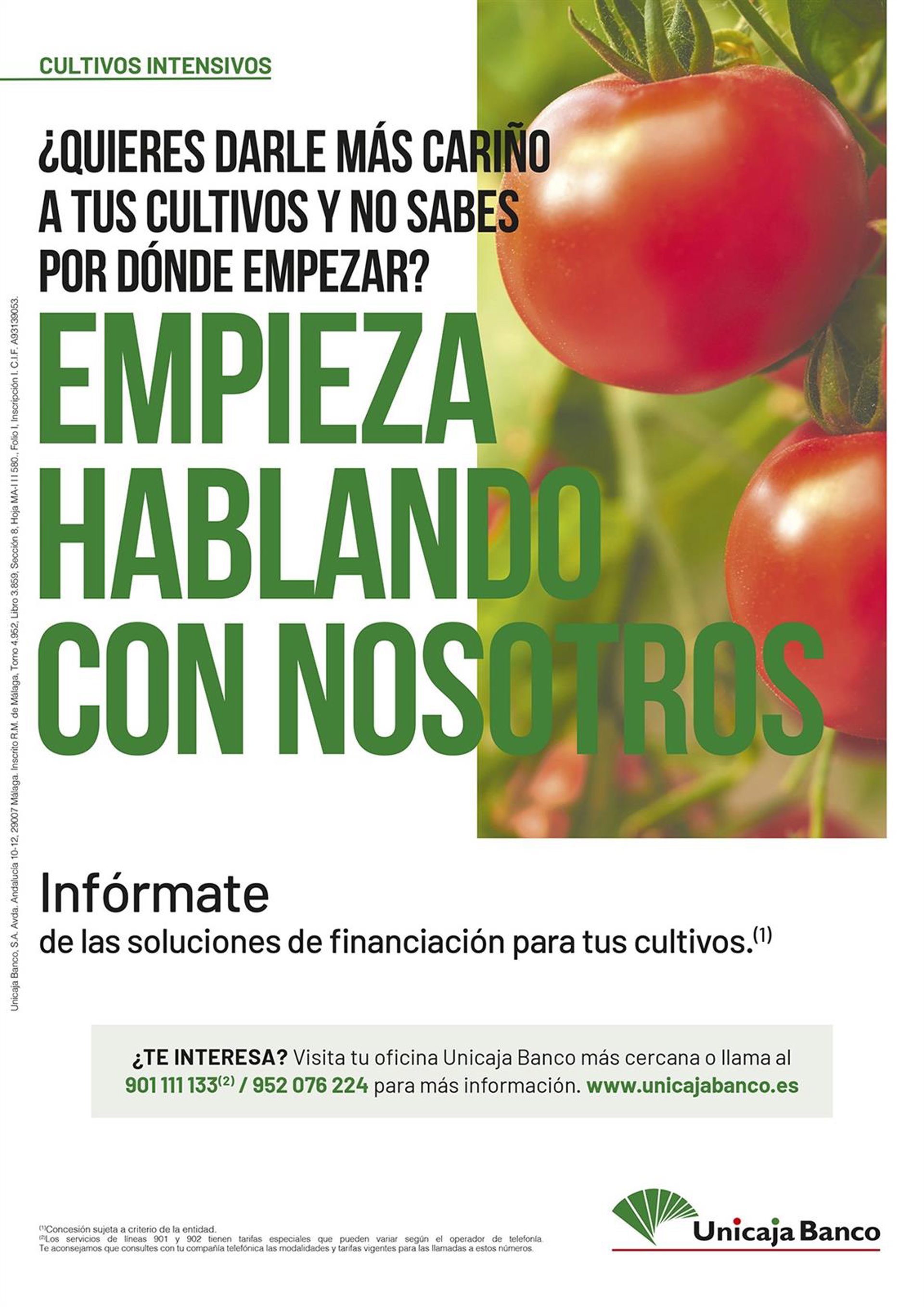 Unicaja Banco, coincidiendo con el inicio de la temporada agrícola 2018-2019, ha lanzado su nueva campaña 'Cultivos Intensivos' en la que la entidad financiera mantiene su apoyo al sector agrario, ofreciendo 310 millones de euros en su línea de préstamos preconcedidos dirigidos fundamentalmente al gremio hortofrutícola.