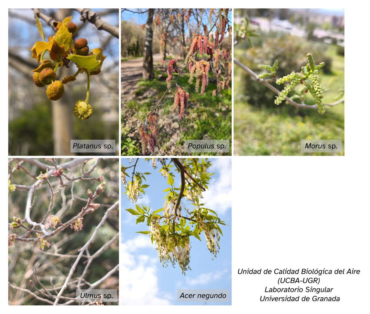 Como es habitual en la atmósfera de la ciudad de Granada desde que la UCBA-UGR tiene registros (más de 30 años), estas fechas se caracterizan por el descenso significativo de polen de ciprés en el aire y del aumento de tipos polínicos como los del plátano de sombra, moreras, negundos, álamos-chopos, olmos y pinos.
