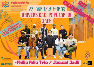 Los talleres 'La Música nos Mueve', surgidos en diferentes ciudades andaluzas en el marco del "Proyecto #Tú También" llegarán el próximo 27 de abril a la Sede Central de la Universidad Popular, ha informado este domingo en el Ayuntamiento, que ha explicado que esta acción, promovida por Fondo Andaluz de Municipios para la Solidaridad Internacional (Famsi) está "coordinada con organismos que garantizan el componente de intercambio y proyección trasnacional", como la Federación de Colectividades Locales del Norte de Marruecos y Andalucía (Federación AnMar), Ciudades y Gobiernos Locales Unidos (CGLU) y la Organización Internacional de las Migraciones (OIM).