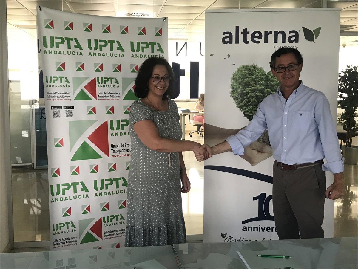 La secretaria general de la Unión de Profesionales y Trabajadores Autónomos de Andalucía (UPTA-A), Inés Mazuela, y el gerente de la Fundación Alterna, Luis Felipe Campuzano, han firmado un acuerdo de colaboración con el objetivo de desarrollar iniciativas y realizar acciones que potencien la orientación, formación e inserción profesional de las personas en situación o riesgo de exclusión.