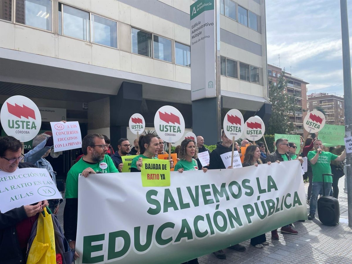 Sindicalistas de Ustea se han concentrado este miércoles ante la Delegación Territorial de Desarrollo Educativo de la Junta de Andalucía en Córdoba, con el apoyo de la Plataforma de Niñxs del Sur y Marea Verde Córdoba para reclamar más personal y recursos para los centros educativos públicos de la provincia.