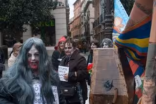 La segunda concentración, que ha arrancado sobre las 12,00 horas, ha sido organizada por los vecinos de Santa Adela, que se han disfrazado de zombis para escenificar que el Ayuntamiento de Granada ha dejado "muerto" el proyecto de rehabilitación de las viviendas de la zona, tras haber ejecutado dos de las cinco fases previstas.