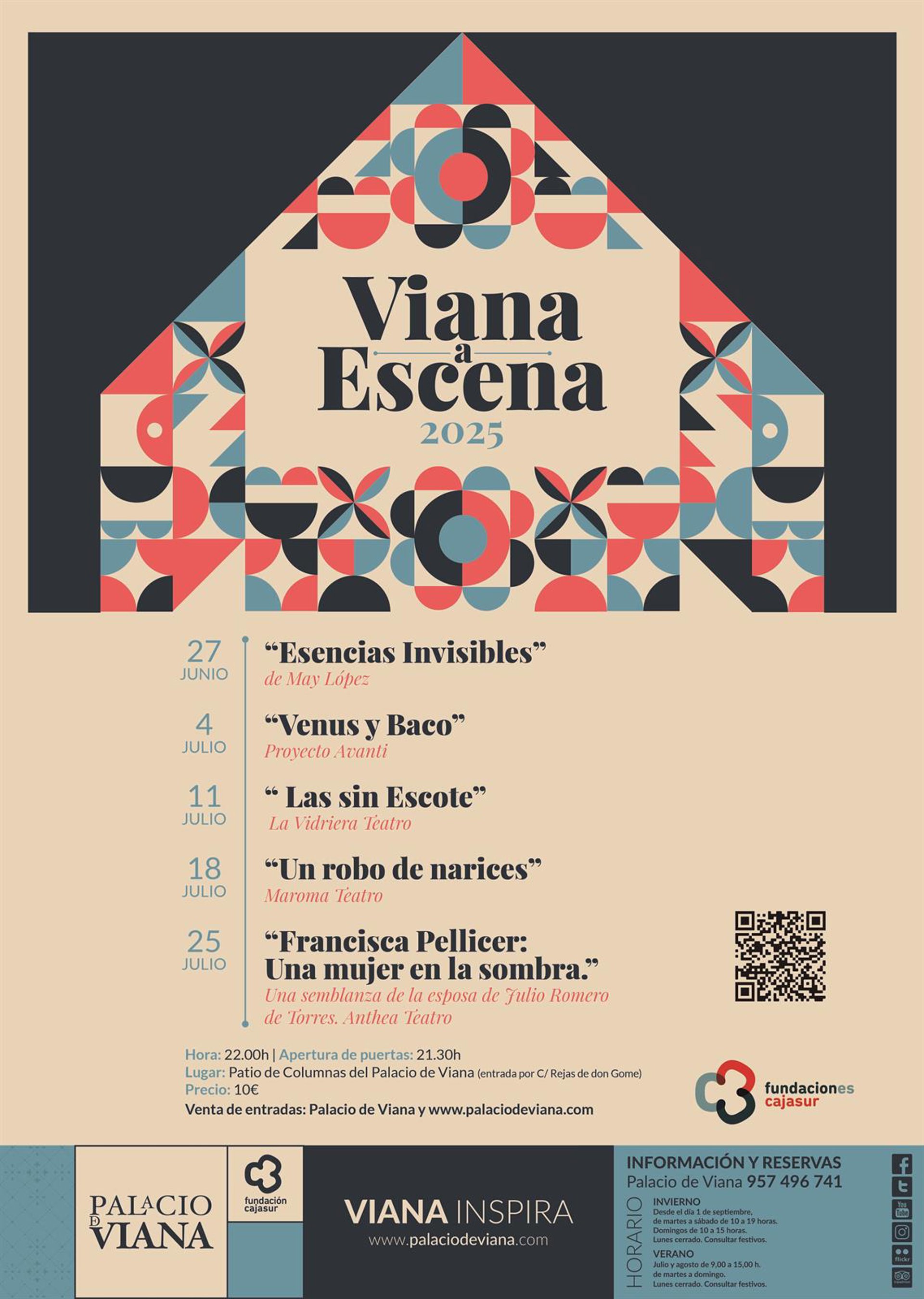 Todas las representaciones de este nuevo ciclo de 'Viana a escena' tendrán lugar a las 22,00 horas, con entrada al Palacio de Viana por la calle Rejas de Don Gome, con apertura de puertas a las 21,30 horas y al precio de diez euros por cada entrada, que se pueden adquirir en la web 'www.palaciodeviana.com'.