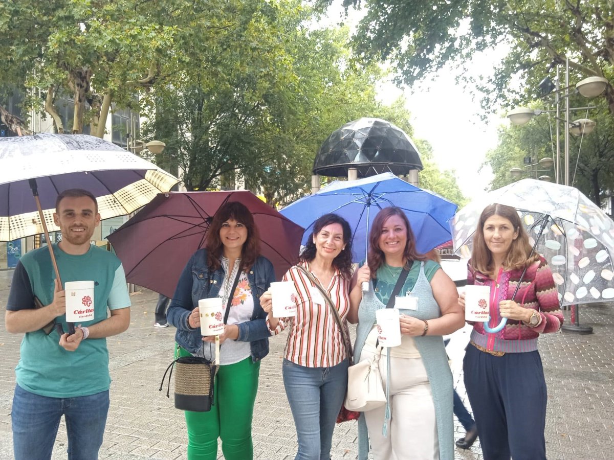 Este jueves 8 de junio, Día del Corpus Christi y Día de Cáritas, voluntarios de la organización eclesial han salido a la calle para llevar a cabo la tradicional cuestación de esta jornada, aunque la lluvia no ha permitido llevar a cabo el acto de sensibilización programado en la Plaza de Las Tendillas.