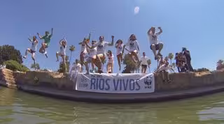 En esta edición del 'Big Jump', voluntarios de WWF están limpiando residuos y protestan con un cartel en el que está escrito 'Badurrio'. Con esta palabra, inventada por WWF, denuncian que los ríos han dejado de existir tal como se conocían, porque en la actualidad "muchos de ellos están en un pésimo estado".
