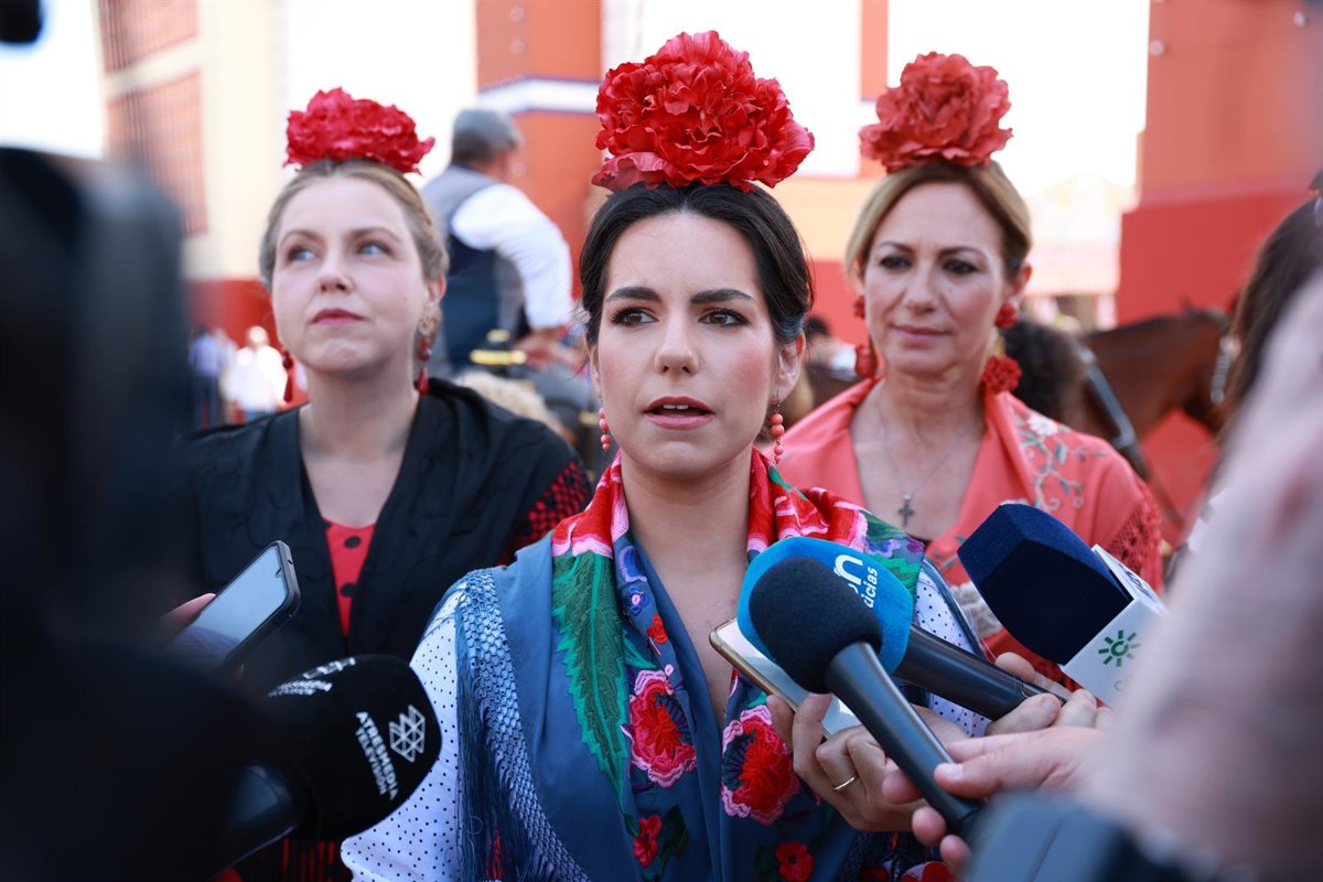 La portavoz de VOX en el Congreso, Pepa Millán, atiende a los medios de comunicación en la portada de la Feria de Abril, a 16 de abril de 2024, en Sevilla, Andalucía (España). Hoy, en este caluroso martes de Feria, políticos de todas las ideologías llegan - Rocío Ruz - Europa Press