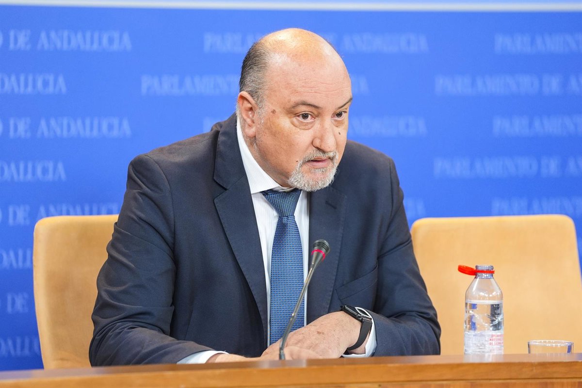 El portavoz adjunto del Grupo Parlamentario Vox en Andalucía, Ricardo López Olea, este jueves en rueda de prensa en el Parlamento. - Joaquín Corchero - Europa Press