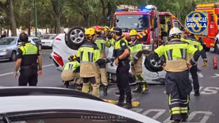 Un amplio dispositivo de la Policía Local, Bomberos y Emergencias 061 ha intervenido este miércoles en un aparatoso siniestro vial, en Sevilla, originado por la colisión entre dos turismos, que ha provocado el vuelco de uno de ellos.