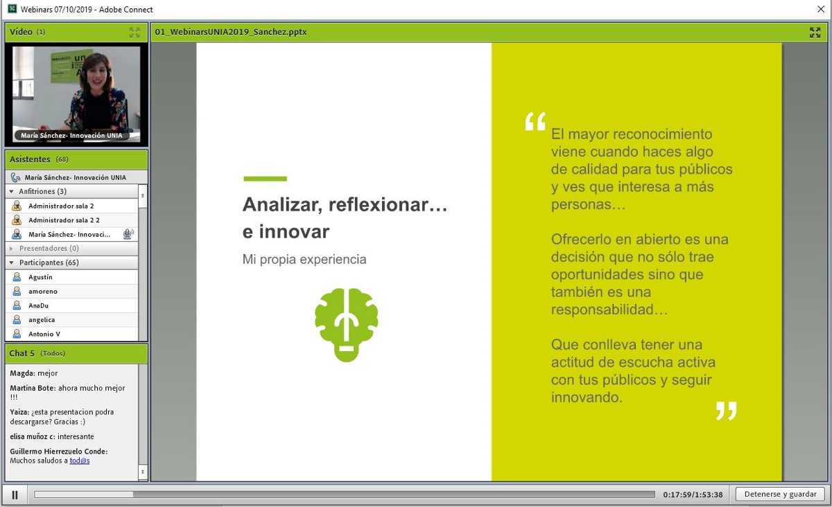 Una vez realizado, tanto las presentaciones como las grabaciones de cada 'webinar' se comparten en abierto online, bajo licencia Creative Commons, a través del canal de presentaciones y vídeos de la UNIA y del propio repositorio institucional de la universidad. Computando las grabaciones de 2019 hay cerca de medio centenar ya disponibles en red. "Esto permite su uso y reutilización, contribuyendo de esta forma a generar conocimiento abierto en torno a materias imprescindibles hoy para cualquier profesional, no sólo docentes", han concluido desde la UNIA.