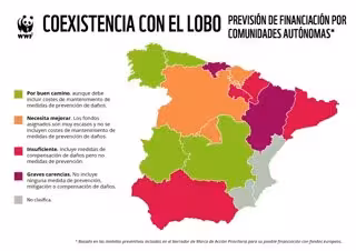 En el lado opuesto, WWF sitúa a Cantabria, Aragón y Cataluña, que "no contemplan en absoluto la medida, o no asignan presupuesto". Precisamente, añade que los conflictos de la ganadería con el oso y el lobo han aumentado en estas regiones por la falta de prevención de ataques ante la dejadez de la administración.