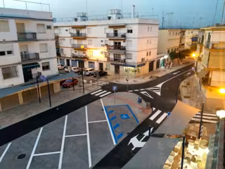 Los acerados situados junto a las dos fachadas, amplían su latitud para mejorar el tránsito peatonal, dando así mejor servicio a la actividad comercial de la zona. Las características constructivas del aparcamiento se ha realizado con solera de hormigón armado, los viales de tráfico rodado de aglomerado asfáltico y el acerado con solera de hormigón para las zonas ampliadas y nueva solería integral con un tratamiento unitario e identificativo de la zona.