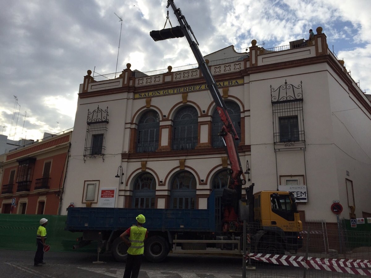 La actuación de renovación en el Teatro municipal Gutiérrez de Alba, edificio regionalista del arquitecto Juan Talavera que se construyó en la ciudad con motivo de la Exposición Universal de 1929, continúa a buen ritmo y esteviernes era visible la grúa que facilita la intervención en la cubierta.