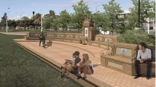 Esta réplica de la Fuente de las Naciones respetará el diseño y construcción de la estructura original mediante el empleo de ladrillo aplantillado, cerámica vidriada y elementos de forja, que conformarán un banco corrido con respaldo de forma elíptica.