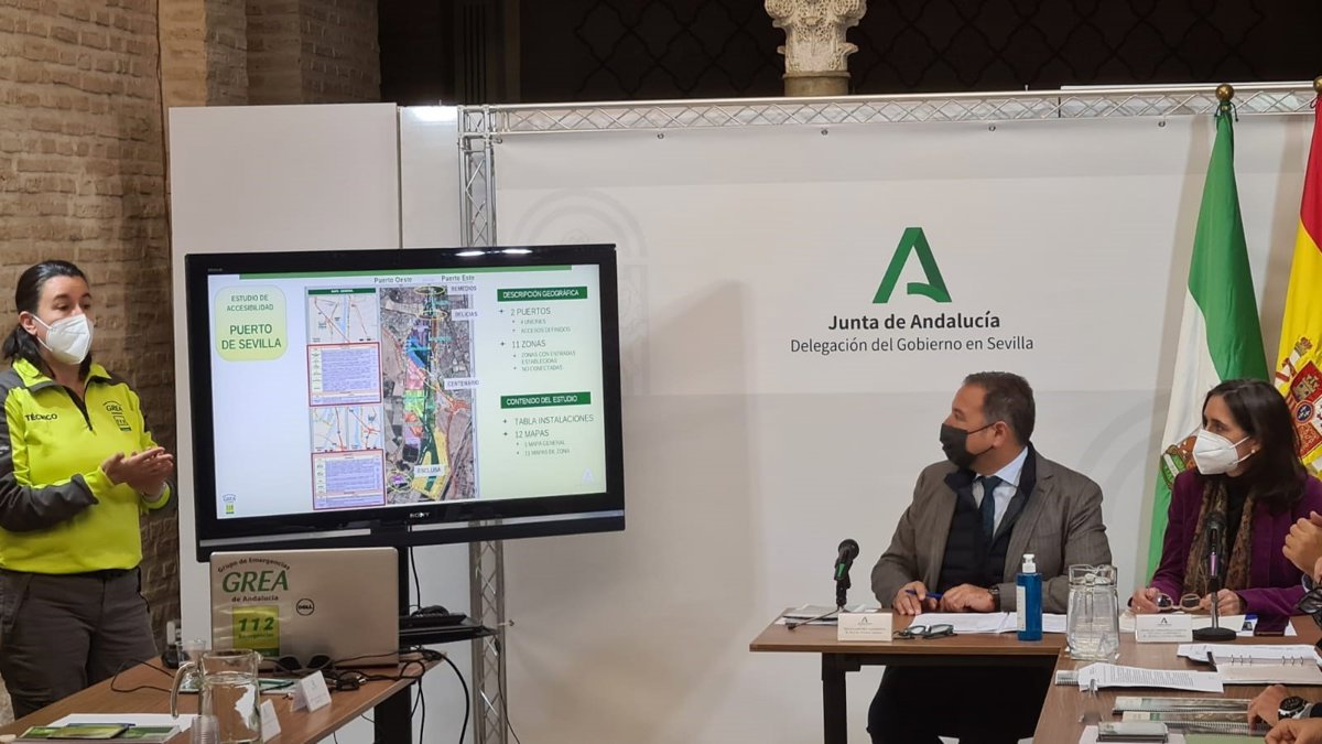 El delegado del Gobierno de la Junta en Sevilla, Ricardo Sánchez, y la delegada territorial de Fomento, Infraestructuras, Ordenación del Territorio, Cultura y Patrimonio Histórico en Sevilla, Susana Cayuelas, han presentado este martes la actualización del Estudio de Accesibilidad del Puerto de Sevilla en una reunión mantenida con los distintos servicios de emergencia de la provincia.