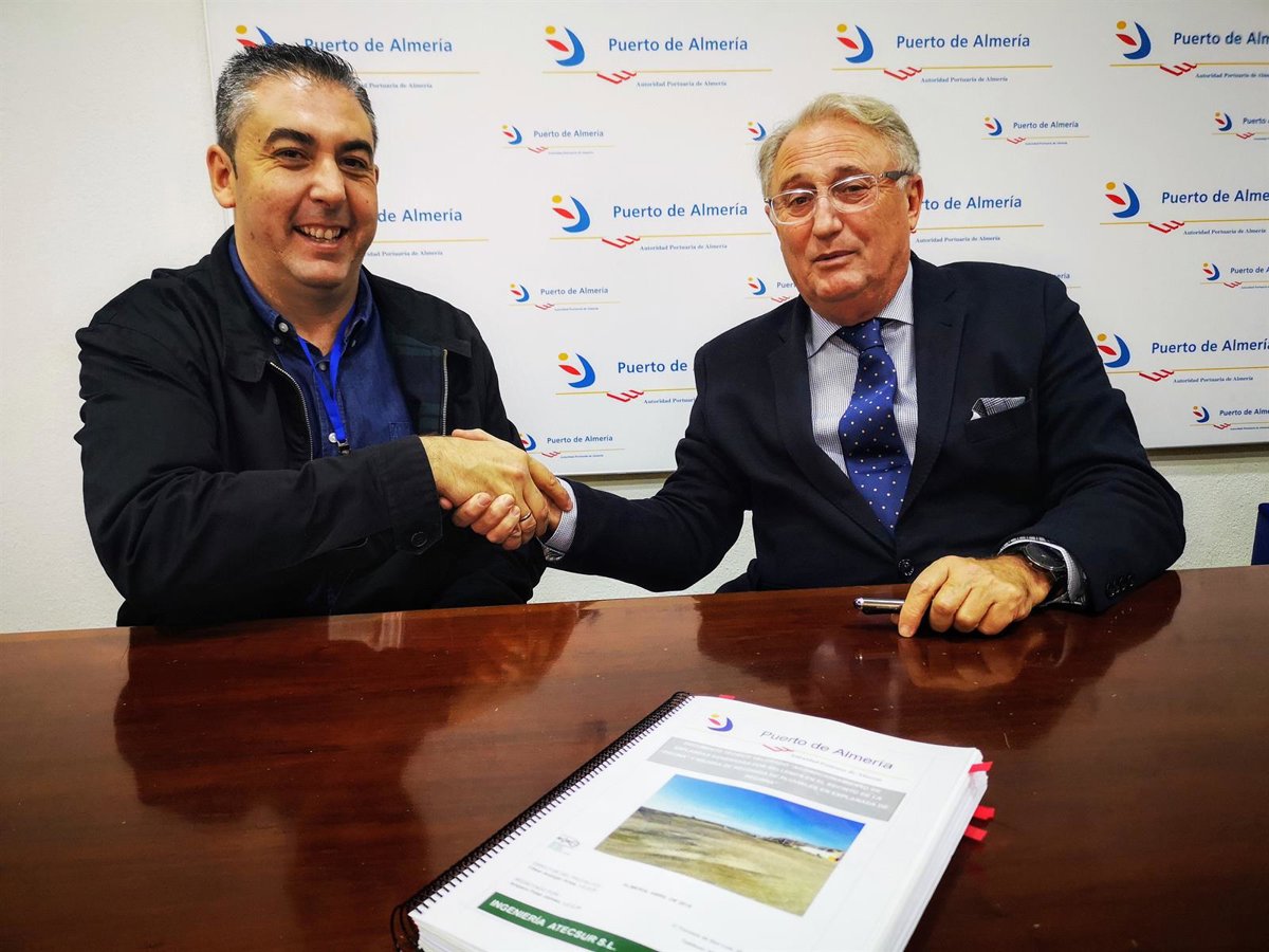 El presidente de la Autoridad Portuaria de Almería, Jesús Caicedo, y el gerente de la empresa Incoal, Pedro Luis Martínez Rubio, han firmado este miércoles el contrato por el cual esta empresa realizará las obras de acondicionamiento de las explanadas generadas por rellenos en el recinto portuario conocido como La Piscina, así como la mejora de recogida de pluviales en la explanada del Muelle de Pechina, del Puerto de Almería.