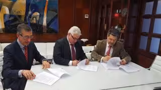 El presidente de la Autoridad Portuaria de Huelva, Javier Barrero, y el director general de Metalurgia, junto con director de Ingeniería y Servicios de Operaciones de Atlantic Copper, Miguel Palacios y Francisco Martín, han firmado este jueves un Convenio de Buenas Prácticas Ambientales para el fomento de estas prácticas por parte de la compañía metalúrgica.